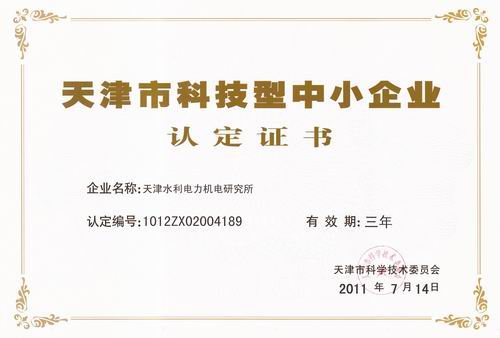 为贯彻落实《天津市委、市政府关于促进科技型中小企业发展的若干规定》,天津市科委于2010年启动了“天津市科技型中小企业”的认定工作,通过企业申报和专家评审,我所被正式认定为“天津市科技型中小企业”(证书编号:1012ZX02004189)。