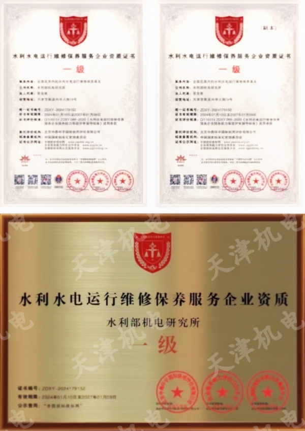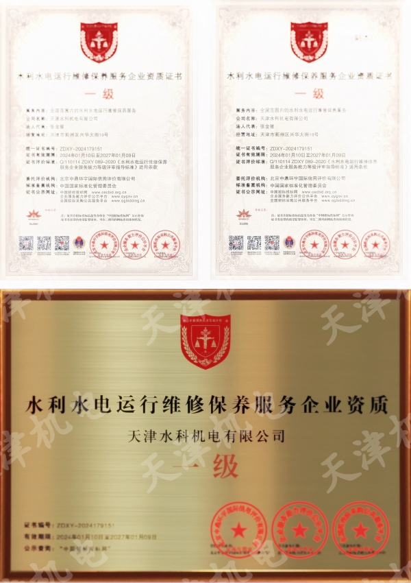 我所荣获“水利水电运行维修保养服务”一级企业资质
