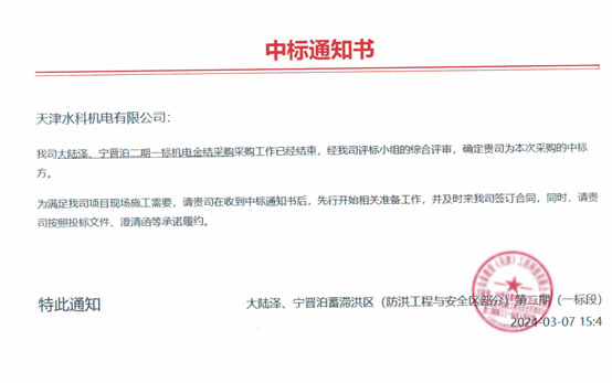 2024年3月6日,我所成功中标邢台市国家重点水利工程——大陆泽、宁晋泊蓄滞洪区防洪工程一标段机电设备、金属结构总承包项目。