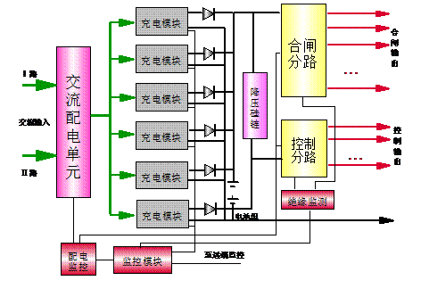 电力操作电源系统主要由交流配电单元、充电模块、监控模块、配电监控、降压硅链、直流馈电单元、绝缘监测等几大部分组成。不同的接线方式有不同的输出馈电,但基本原理是一致的,原理框图如图所示。