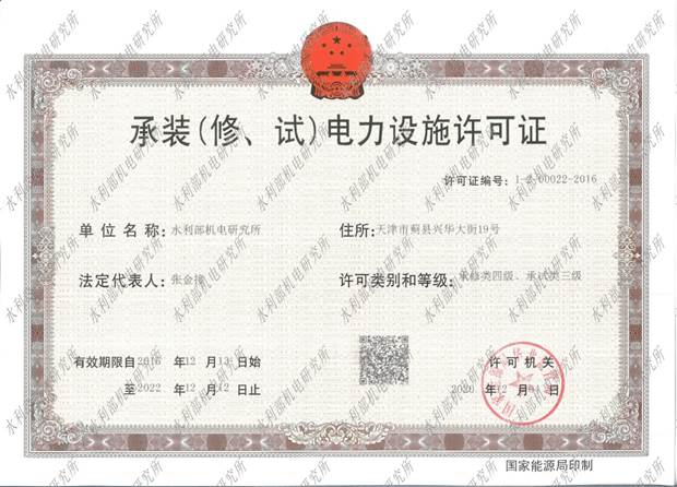 日前水利部机电研究所顺利通过了《承装(修、试)电力设施许可证》三级资质的申请,该证书的获取标志着我所可承担110KV及以下电力设施试验工作。