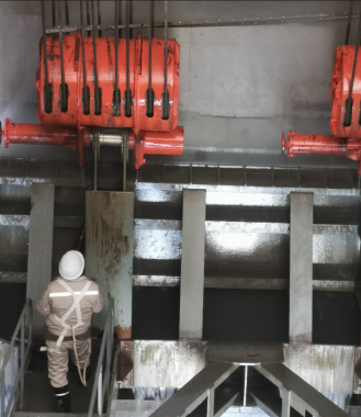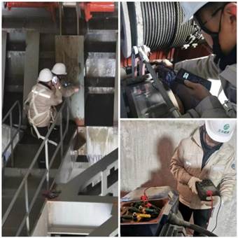我所技术人员携带专业检测设备,克服高原反应的身体不适,及时调整身体状态开展了现场检测工作。检测内容包括水工建筑物及附属设施的巡视检查,闸门腐蚀状态、蚀余厚度、材质现场检测,闸门一类焊缝、二类焊缝超声波无损探伤抽检。进行启闭机运行状况检测,结合现场检测数据对闸门结构进行了复核计算,按设计要求对启闭力等进行了复核计算。